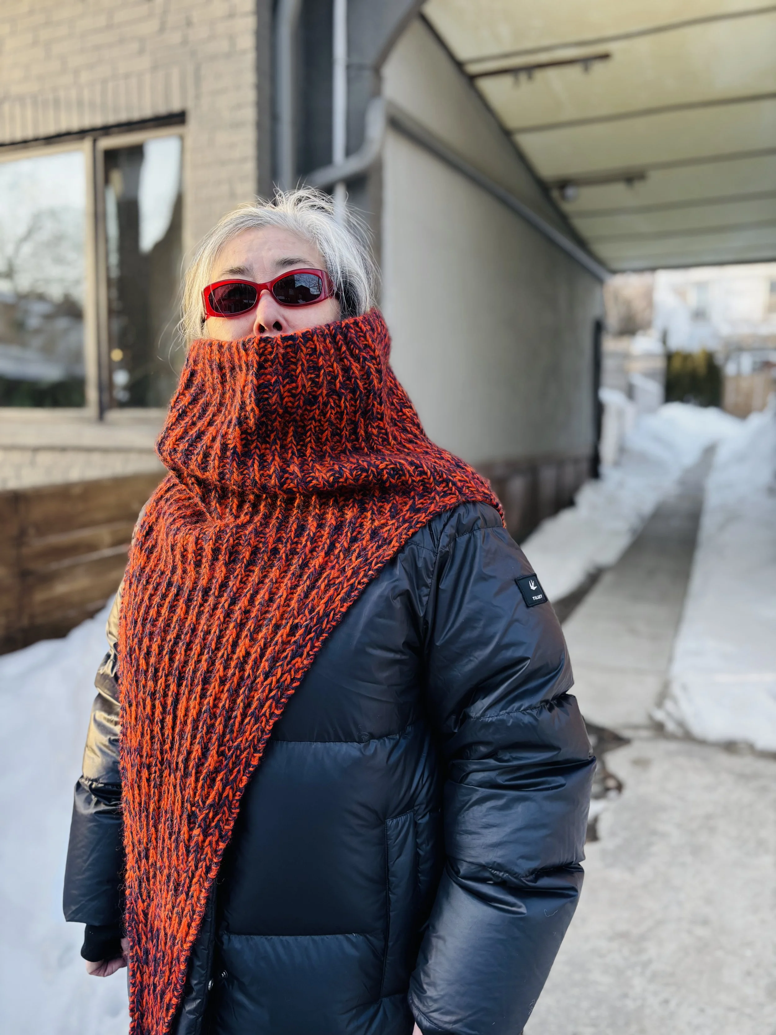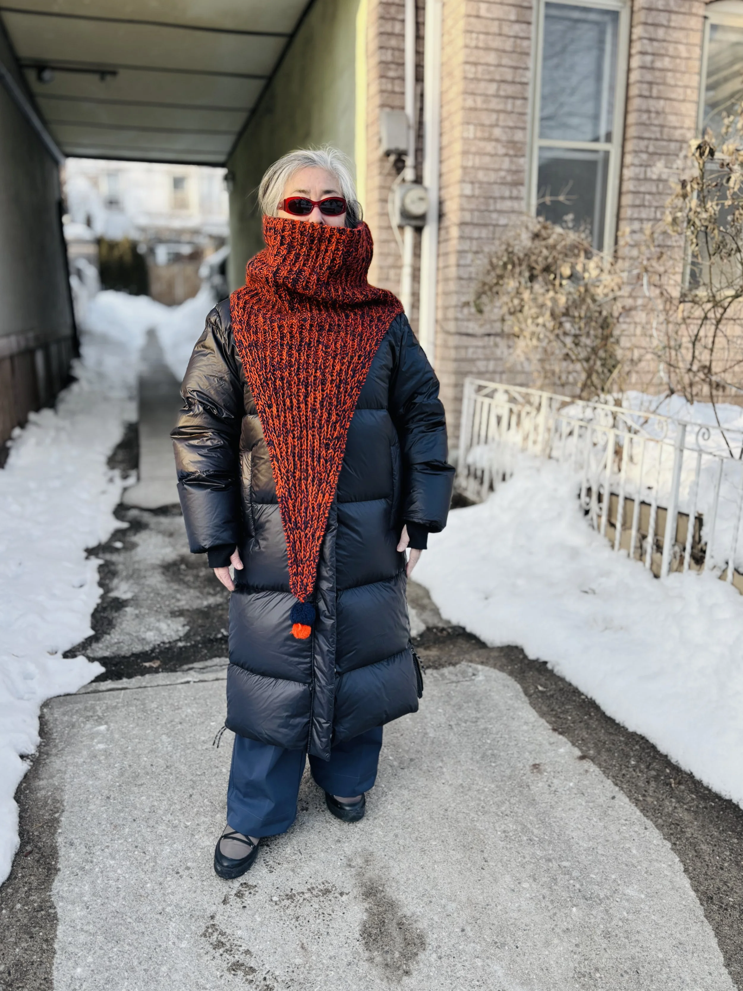 Aphelion is a long pointed cowl worked from the top down in Fisherman’s Rib. It is first worked in the round to create a tubular shape, and then is split and worked flat to make the front and back triangular points. The back and front points are shaped the same, so the finished cowl is reversible. The yarn is held double throughout the pattern in two colors to create a marled effect. It was originally published in Cosmology Daruma 2022. Pattern is written in English and Japanese.