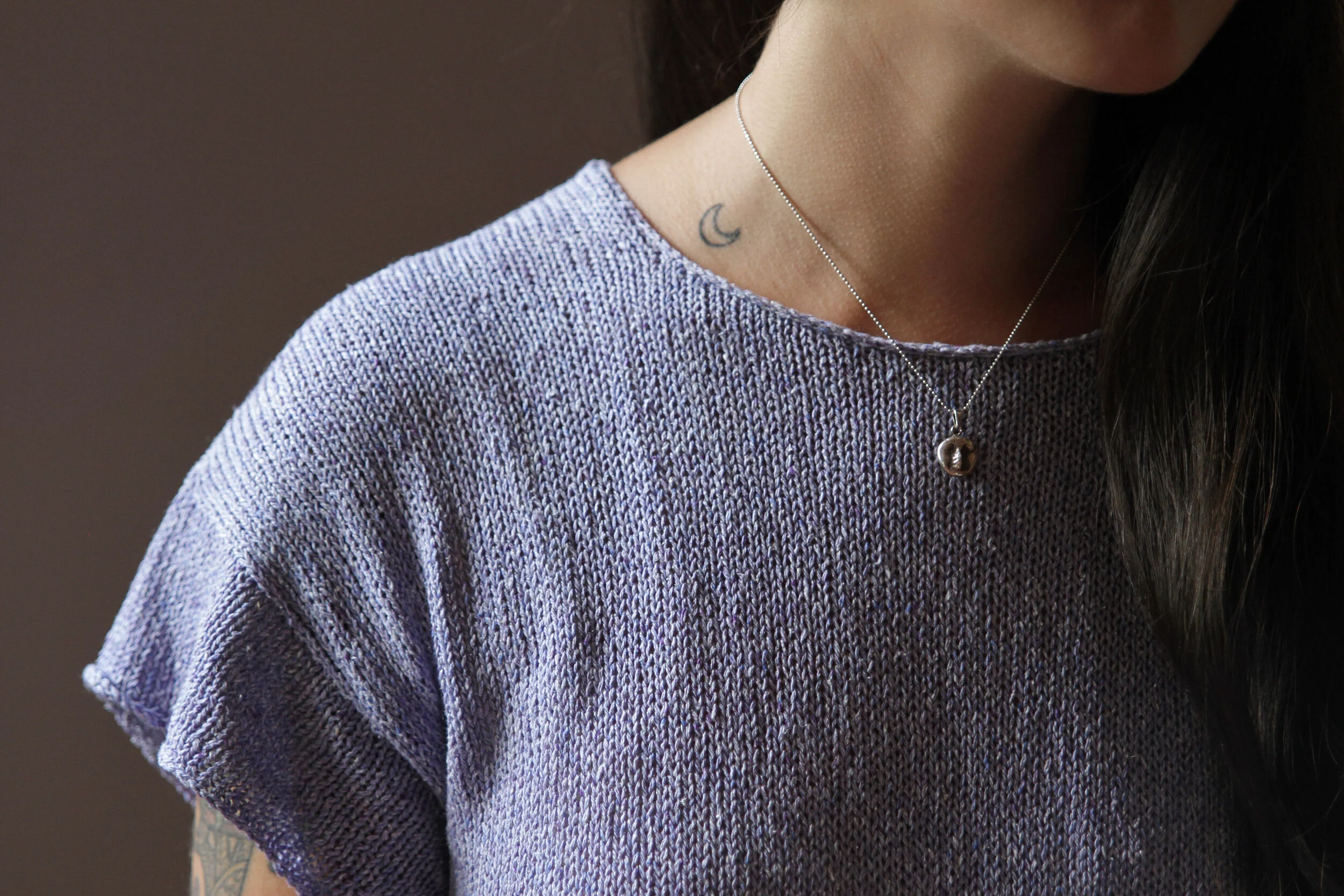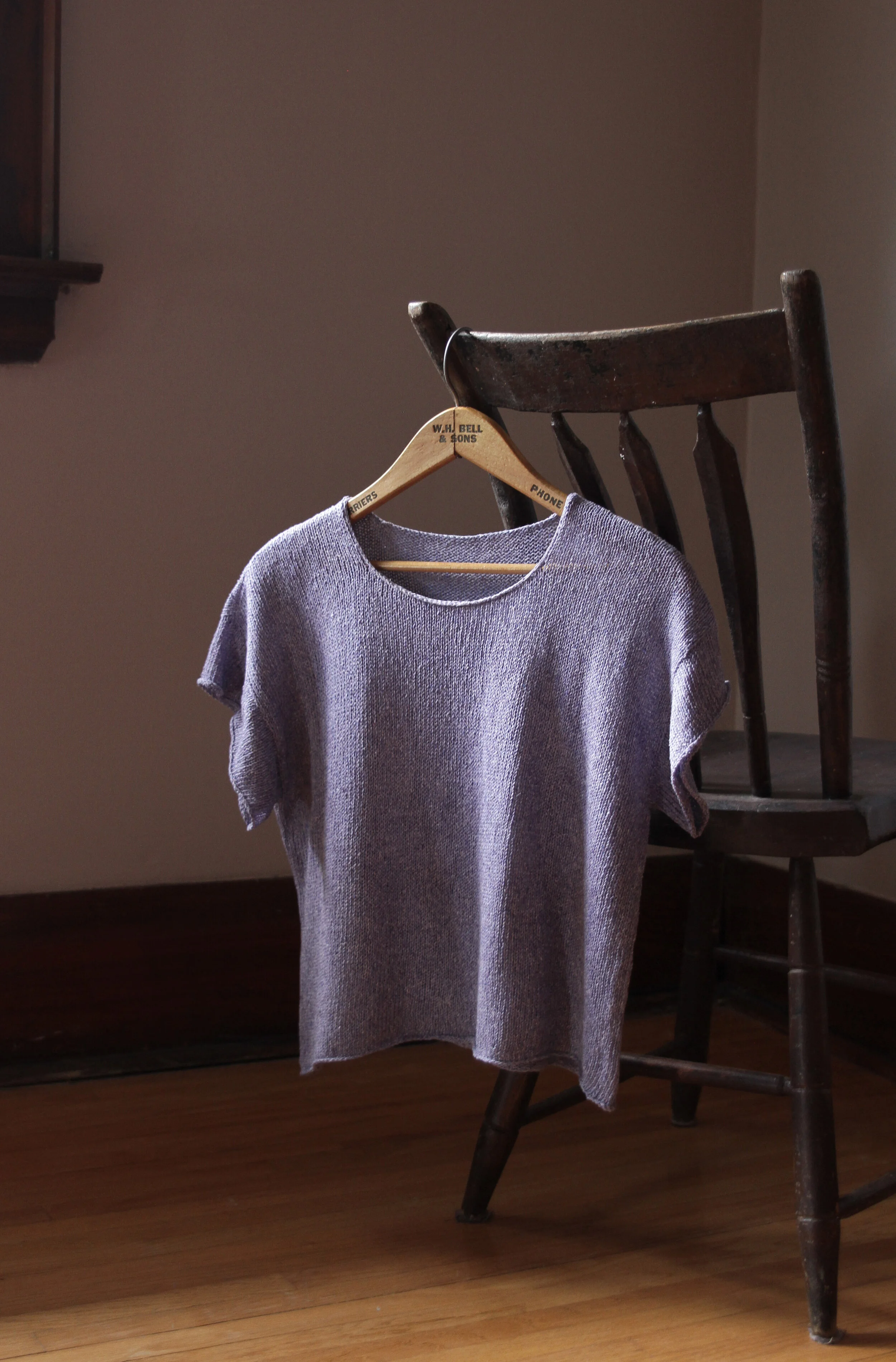 This tee is knit in the round from the bottom up to the armholes, then stitches are divided and the back and front are worked flat separately. Shoulders are shaped using wrap and turn short rows and are joined with a 3-needle bind off. Sleeves are picked up around armhole edges and worked in the round. Lastly, stitches are picked up around neck edge and are bound off immediately for a very minimalist neckline.