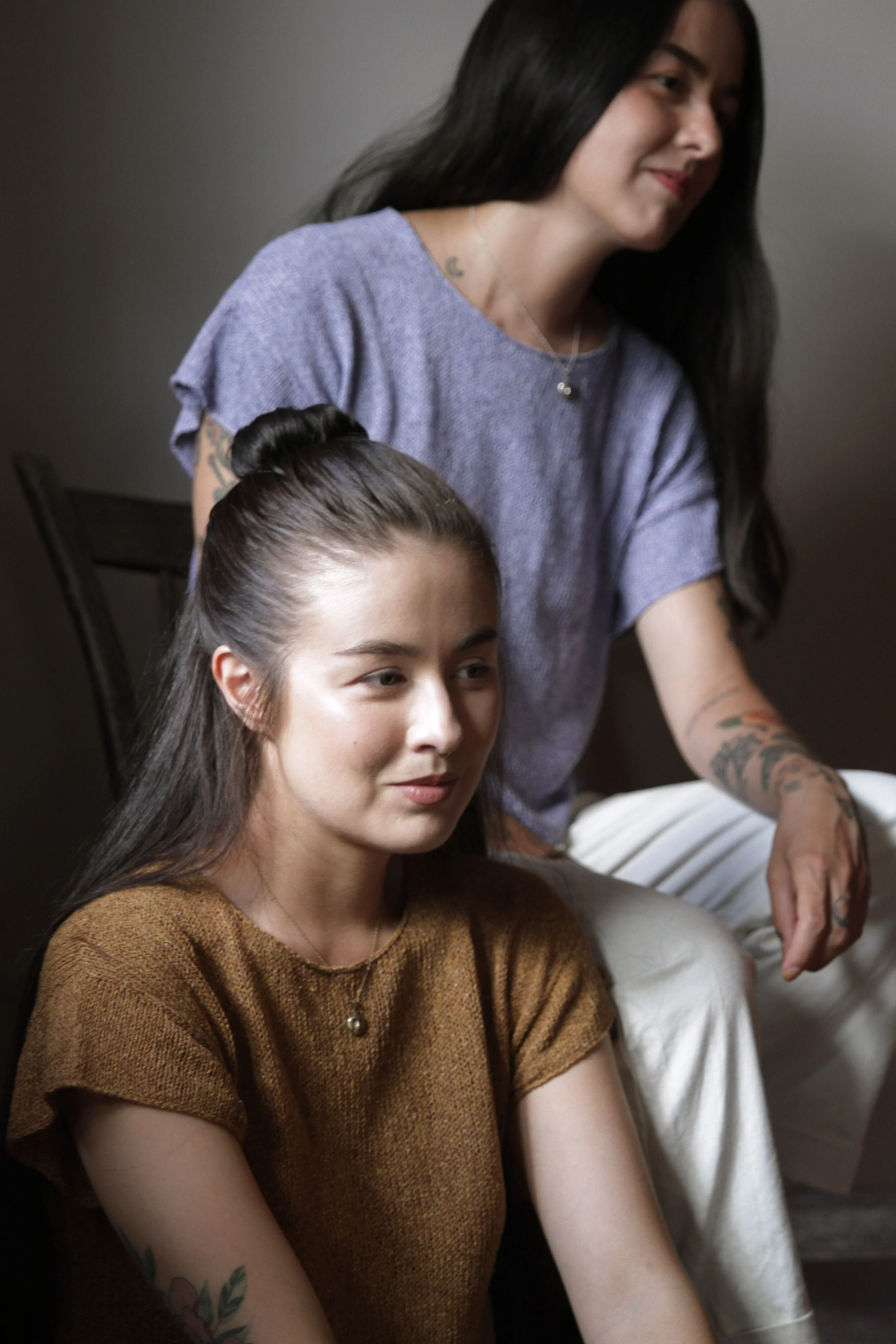 Samples shown are in size 1 (Cork Tree) and 2 (Pale Aster) with approx 10 - 20 cm / 4 - 8” positive ease respectively on models who are 155 cm / 5'1" tall with approx 81 cm / 32" chests.